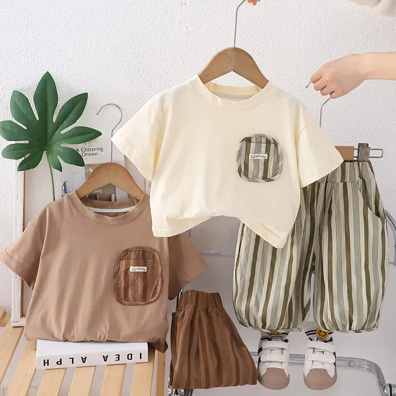 סט קיץ יוניסקס בסגנון טרנדי ואוורירי – מושלם לבנים ולבנות בגילאי שנה עד שלוש. כולל חולצה עם שרוולים קצרים בדוגמת פסים ומכנסיים קצרים נוחים עם גזרה קלילה. עשוי בד כותנה משולב ספנדקס לנוחות מרבית ולתחושת גמישות בתנועה.